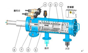 水力驅(qū)動(dòng)自清洗過(guò)濾器由主管組件、端蓋組件、細(xì)濾芯組件、粗濾芯組件、吸污器組件、水力馬達(dá)、水力缸組件、排污閥、管路控制系統(tǒng)等主要零部件組成。水由入水 口進(jìn)入過(guò)濾器,首先經(jīng)過(guò)粗濾芯組件濾掉圈套顆粒的雜質(zhì),然后到達(dá)細(xì)濾網(wǎng),通過(guò)細(xì)濾網(wǎng)濾除細(xì)小顆粒的雜質(zhì)后,清水由出水口排出。